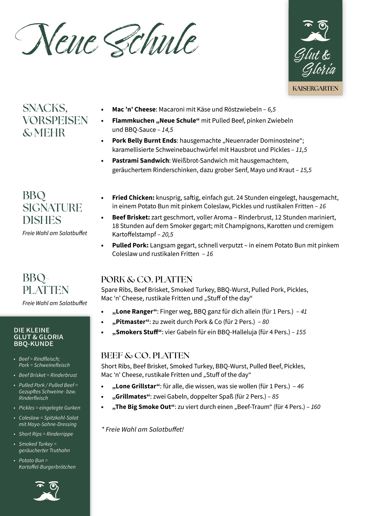 Und „Neue Schule“, das ist das Feuer unserer BBQ-Küche: Low-&-Slow-Gerichte, die über Stunden bei niedriger Temperatur gegart werden, von Burnt Ends über Pastrami-Sandwiches bis zu kreativen Grill-Highlights.