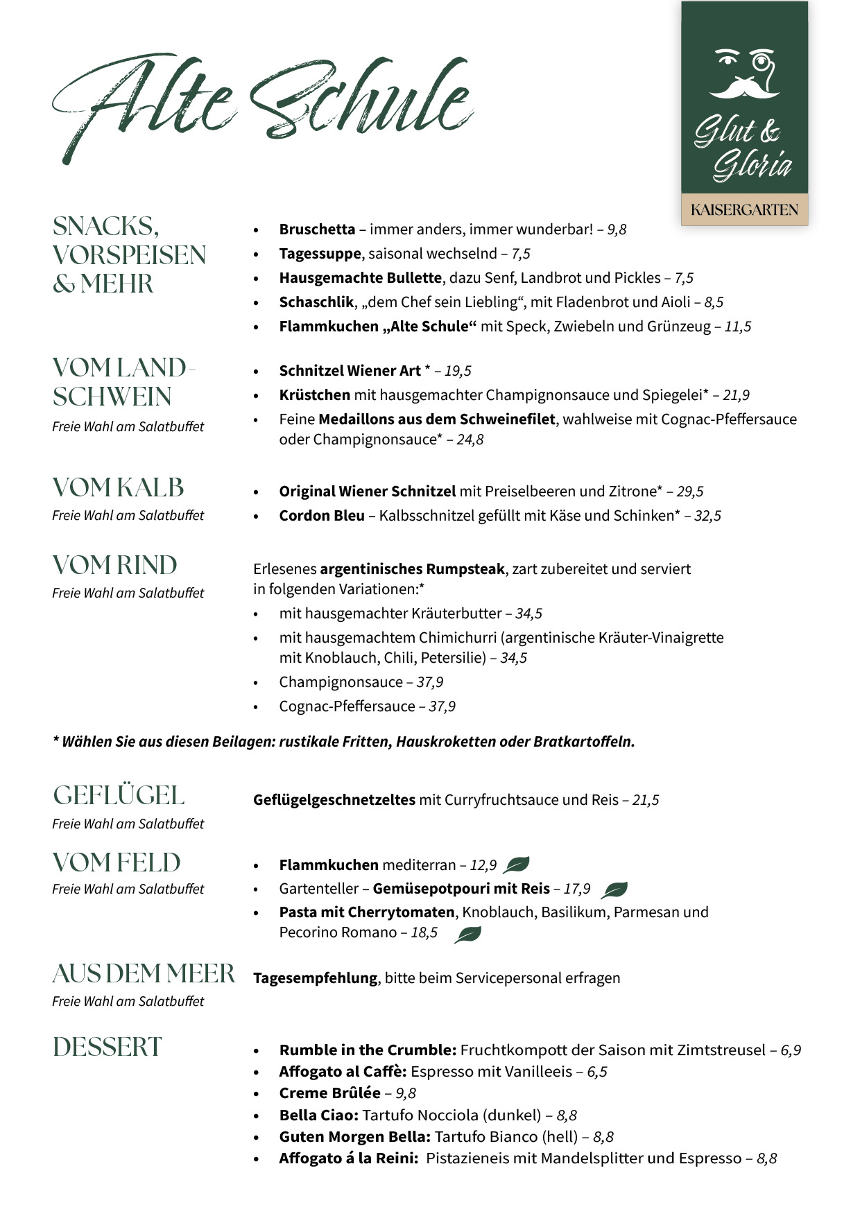 Unsere Küche steht für zwei Welten: „Alte Schule“: das sind die Klassiker, die man kennt und liebt. Von Schaschlik bis Rinderroulade, von der Rauchlachsstulle bis zum Flammkuchen.